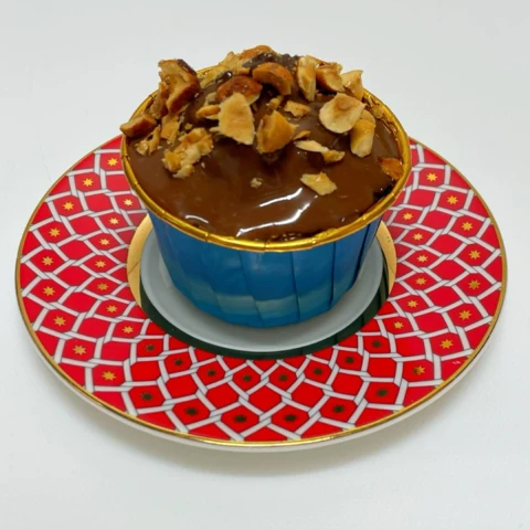 Плотный, влажный шоколадный десерт с насыщенным вкусом и ореховым хрустом. Классическое шоколадное брауни на основе тёмного шоколада, с характерной липкой текстурой, плотной серединкой. В тесто добавлены обжаренные дроблёные ядра фундука, которые придают каждому кусочку приятный хруст и усиливают ореховый аромат. Глубокий шоколадный вкус с лёгкой горчинкой, уравновешенный сладостью и маслянистыми нотами фундука. Идеальное сочетание: к кофе, молоку или красному вину с ягодными нотами